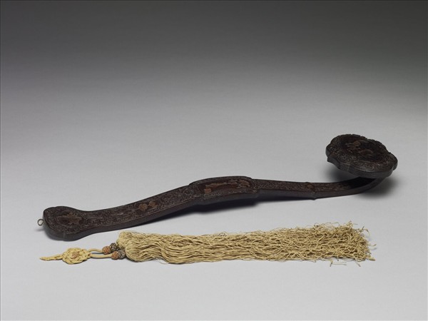 紫檀木質如意,首趾均呈雲葉形,柄中部略隆起,腹部為長方形開光。首、腹、趾部周圍以及柄部浮雕勾連雲紋及變形獸面紋。首、腹、趾面並以淺浮雕勾連雲紋及變形獸面紋為底,並嵌有八寶、盆花圖案,惜嵌件脫落。如意背面淺浮雕有變形雲頭紋、勾連雲紋及柿蒂紋。另帶有米黃結及雙穗。