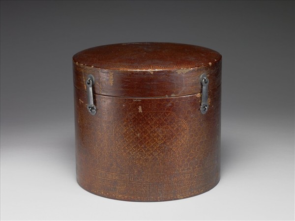 掀蓋式圓筒狀皮盒,開口處以金屬鉤環扣合。盒蓋及盒體下緣繪幾何紋條狀裝飾,盒體滿繪描金龜甲紋錦地,有四海棠形開光,內繪古錢紋錦地及花葉紋,並罩褐色透明漆料;內襯紅色花綾裡,蓋內側有墨書漢、滿、蒙、藏四體字:「利益新造鐵鉢一件」。