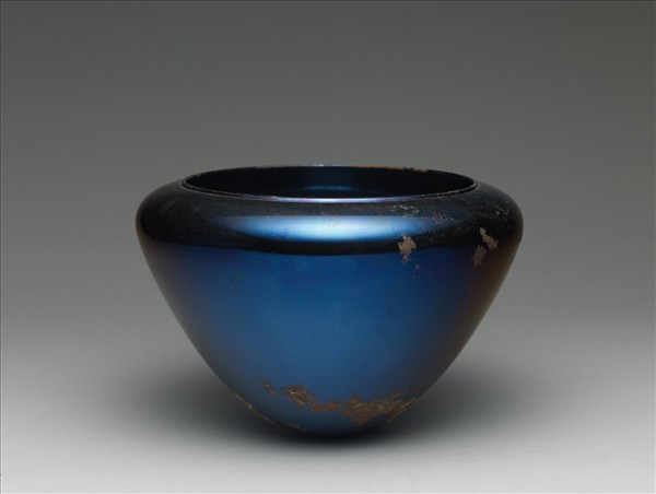 清宮作品。斂口鉢,底銳而圓,壁極薄,甚輕,通體靛藍色,表面已露多處鐵鏽。院藏此種鐵器鍍藍的技法,僅見於此種鉢形器皿,似乎意起於仿青金石鉢。附描漆皮盒,盒蓋內墨書漢、滿、蒙、藏文字,曰:「乾隆六十年(1795)八月二十八日,新造炕老鸛翎鐵鉢一件。」