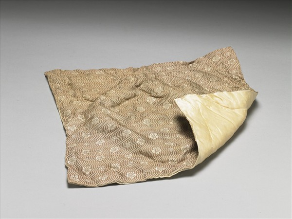 方形錦袱,正面織錦為米色地,佈滿棕色水紋錦地,間飾五辦花卉。內裏為米色地,光素無紋。
