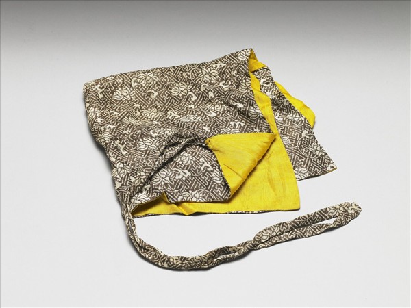 方形錦袱,正面織錦為白地,佈滿棕色萬字錦與牡丹紋,內裏為黃地,頂端帶兩條繫帶。