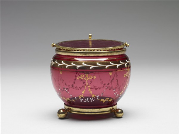 桃紅色玻璃圓盒一組(故雜467-故雜470),呈束口橢圓腹與直壁兩種形式。口沿鑲金屬釦,與平頂蓋相連,底部鑲金邊及三足。橢圓盒頂蓋內托鑲玻璃鏡一方,可供旋轉照容。盒外壁以描金、白色琺瑯彩繪花葉串飾。直壁盒蓋頂與外壁以金彩繪飾環狀飛羽紋飾。口沿周邊各飾以金底白色草葉紋與金色雙環。