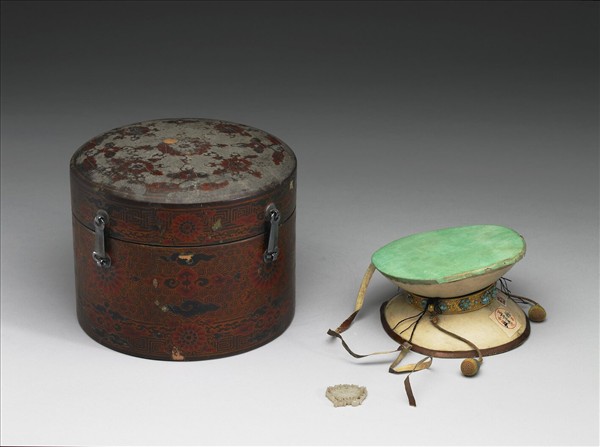 嘎布拉鼓,以男女童頭蓋骨各一,相背黏合而成腰鼓形,中央接合處箍圍松石花纍絲鍍金圈,上有活環,可接飾墜角、墜飾。鼓面獸皮綠漆地。鼓為修密宗作法時驅魔之樂器。帶木胎皮盒。
