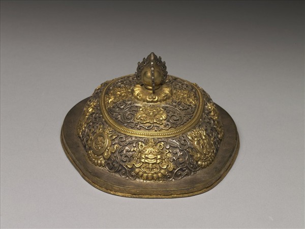 銅鍍金蓋,蓮瓣座寶珠鈕,寶珠帶火焰。蓋外壁鏨連珠一圈分隔為上下兩部分,上半部鏨刻卷枝番蓮花葉,下半部以卷枝花葉為地,每朵盛開花上均見八寶之一,等距排列為八吉祥,其下陰線刻水紋、水波一周。蓋邊廓亦飾連珠紋。本器應為嘎布拉碗之蓋。