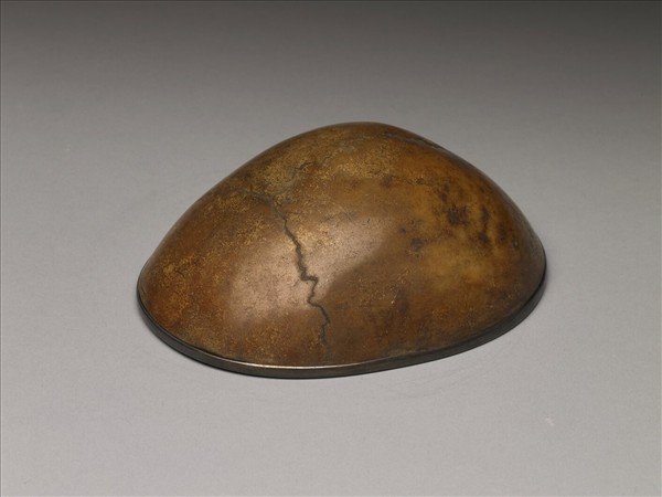 顱骨嘎布拉碗,外壁深褐色。口緣與內壁鑲鍍金銀質裡,但氧化過甚,呈色黯淡,內外均光素無紋。嘎布拉碗係用生前許願者之頭骨,經大喇嘛嚴格審察、認可後,方製成器而獻與佛者。