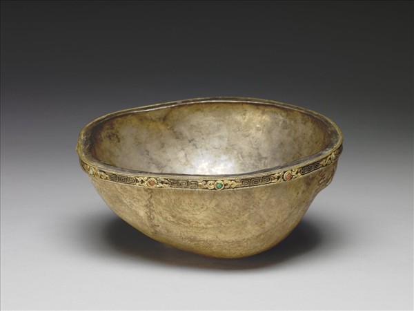 顱骨碗,外壁淺黃褐。口緣與內壁鑲鍍金銀質裡。並貼有黃籤云:「乾隆二十八年十一月二十六日,交收嘎布拉碗一件,係霍濟占」。口緣雕飾紋樣,並鑲嵌珊瑚、松石等,其紋飾以三回紋與卷枝花交替出現,繞飾口緣一周,松石、珊瑚即鑲於花心。嘎布拉碗係用生前許願者之頭骨,經大喇嘛嚴格審察、認可後,方製成器而獻與佛者。