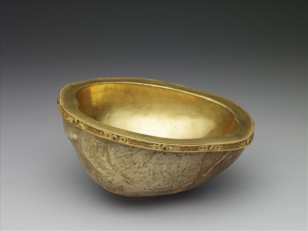 顱骨碗,外壁淺黃。口緣與內壁鑲鍍金銀質裡。口緣雕飾紋樣,並鑲嵌珊瑚、松石等,其紋飾以三回紋與卷枝花交替出現,繞飾口緣一周,松石、珊瑚即鑲於花心,但多已脫落。嘎布拉碗係用生前許願者之頭骨,經大喇嘛嚴格審察、認可後,方製成器而獻與佛者。