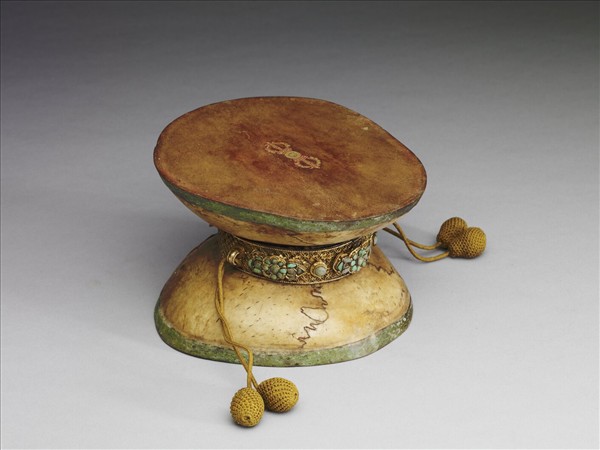 嘎布拉鼓,以頭蓋骨各一,相背黏合而成腰鼓形,中央接合處箍圍鍍金圈,上飾古錢紋錦地盛開花朵,花瓣與花心以綠松石、料石鑲嵌,上有活環,可接飾墜角、墜飾。鼓面獸皮褐地,一面繪飾金剛杵,另面繪金剛彎刀為飾。鼓為修密宗作法時驅魔之樂器。