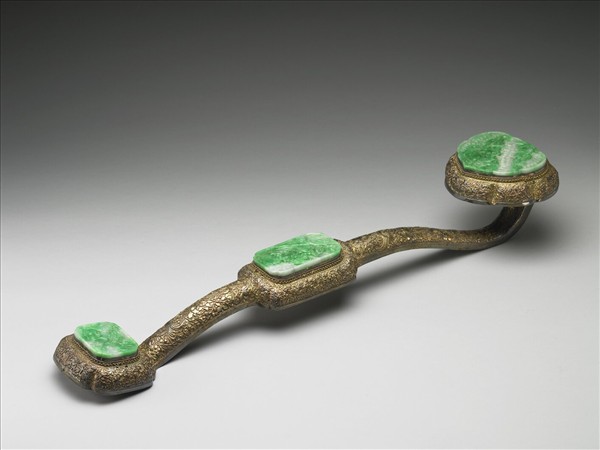 銀如意,通體鐫刻紋飾。正面鐫各式花鳥圖案,皆作浮雕式,背面淺刻蝙蝠祥雲及雙錢圖案。首面翠玉浮雕雲龍,中段鑲玉雕鳳凰牡丹,尾玉雕鶴鹿長春,皆依翠玉之自然色澤雕刻。