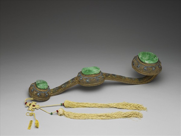 通體皆以鍍金銀絲纍絲透空鑲接而成,如意首、中央、柄尾鑲三翠玉,皆浮雕「太平有象」圖案,即象紋上駝負一瓶,駝瓶諧音「太平」,大象諧音「象」。周圍以纍絲填琺瑯色料,飾山形紋邊飾及朵花紋。器柄正反面纍絲古錢紋,側邊飾圓點紋,正面飾有填料點翠暗八仙圖樣,象徵「八仙祝壽」之意。下垂二黃色編花雙穗。