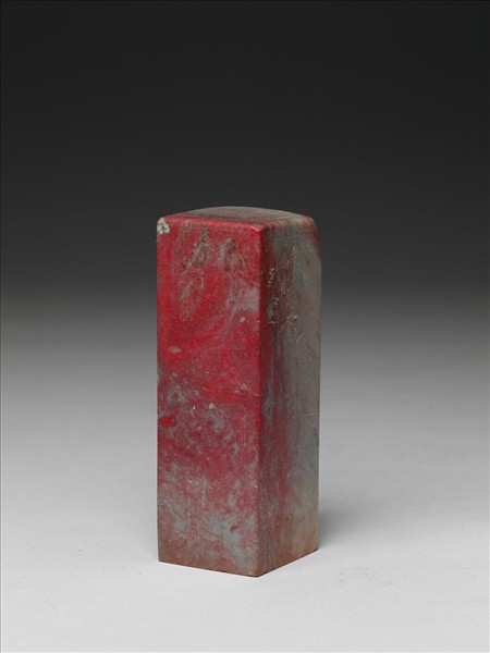 雞血石章,長方體,色灰間紅,紅色主要集中於其中一長方面上。印面正方,刻朱文「日天琳宇」雙行四篆字,線條細勁,並以圓弧為主調,構形出勻整的字架。所謂雞血石,即浙江昌化所產印石,因其色豔紅如雞血,故以此為名。