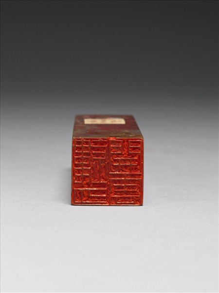 雞血石章,長方體,色灰間紅,紅色漫布於表面。印面正方,刻朱文「鏤月開雲」雙行四篆字,線條細勁而平直方正,造成字架整飭的風格特色。所謂雞血石,即浙江昌化所產印石,因其色豔紅如雞血,故以此為名。