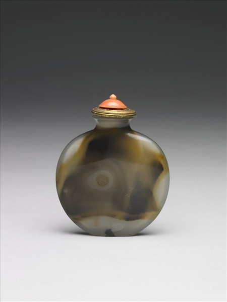 扁圓形鼻煙壺,大面積呈現黑、褐、灰三色瑪瑙天然紋理,帶銅嵌珊瑚蓋及牙匙。