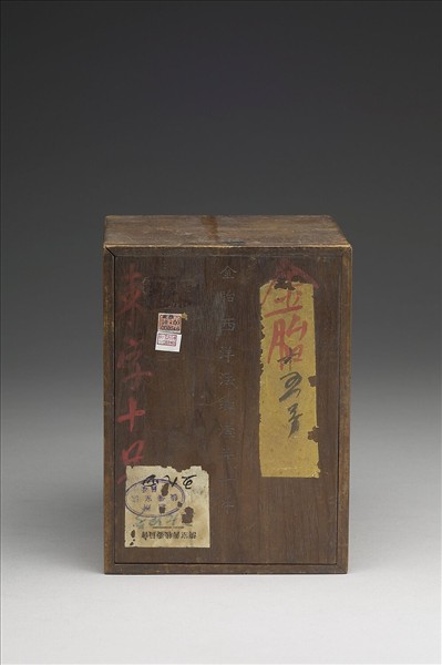 木匣,其上刻有「金胎西洋法瑯渣斗一件」,可見此木匣原為盛裝琺瑯器之用。