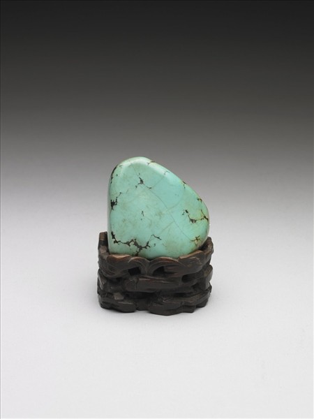 綠松石,不規則而略近卵形,色青綠,間雜黑斑,附雕鏤草葉紋木座。