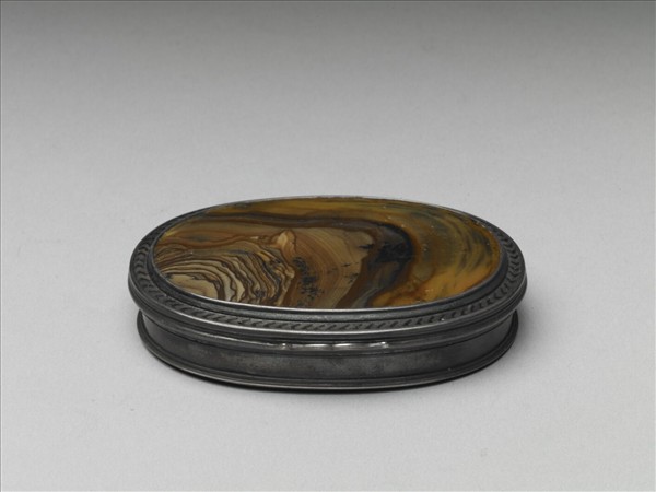 橢圓銀鼻煙盒,上掀蓋嵌木紋石。