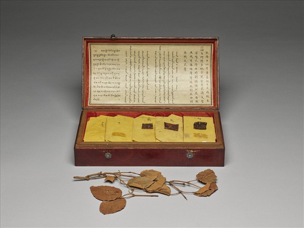 白檀木顯字枝葉收貯於一長方形漆盒內,以黃紙包分別裹覆數片褐色乾葉、兩枝枝葉與樹皮。黃紙包墨書藏文唵、巴、打、吽、惹五字,盒蓋內白色織品可見墨書漢、滿、蒙、藏四體文字;其漢文曰:「乾隆十四年(1749)章嘉胡土克圖欽奉上諭,自阿穆多地方梵宗寺恭請大聖宗喀巴降生時,割臍滴血處自然生成,有番唵等字樣大利益白檀香樹皮花葉」。據悉,此株白檀樹至今仍存。