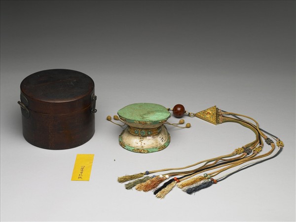 西藏作品,十八世紀嘎布拉手鼓,以男女童頭骨相背黏合成,接合的腰處束以纍絲鍍金嵌松石圈,上設活環,墜蜜臘珠、嵌石鍍金三角形墜,下襯十色絲穗,飾各色珠。鼓腔兩端蒙以皮革,髹繪綠地金彩穿花龍紋。附漆盒,盒內書漢、滿、蒙、藏四體文字:「章嘉胡土克圖恭進利益嘎布拉鼓」。
