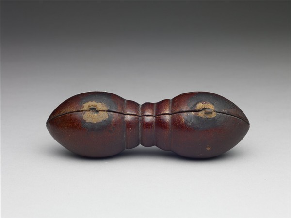 皮盒,盒隨器形。漆色黯褐,側邊裝合葉,另一側可開啟使盒左右打開,內襯紅色花綾裡。與鈴盒連接處斷裂。