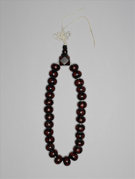 木珠二十八顆,髹塗黑漆,其上紅書梵字。佛頭珠呈十四面體,細刻劃六字真言與大黑天圖像。