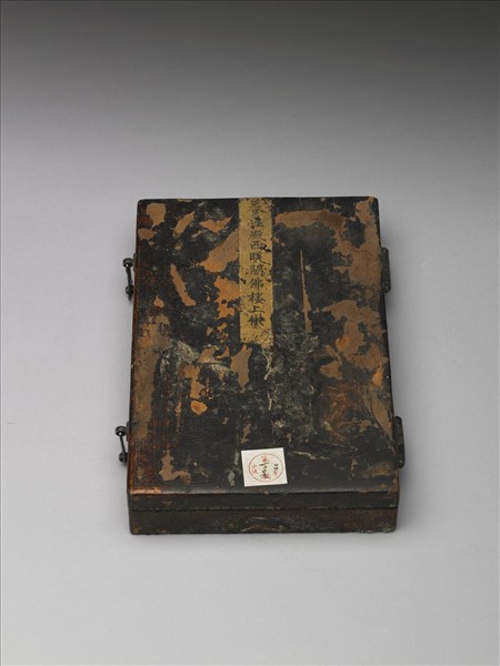 長方形皮匣,帶掀式蓋。蓋與盒以兩金屬條相連,開口處則以兩懸垂式鉤環扣合。匣身表面多處斑駁。蓋面黃籤書:「養性殿西暖閣佛樓上供」。匣蓋裡墨書「乾隆四十五年(1780)十月二十七日班禪額爾德尼在寧壽宮念經,呈進嘎布拉念珠一盤。」