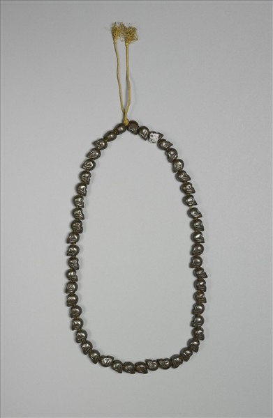 念珠一串,共由五十顆銀色骷顱頭相互串連而成,頂端綁縛一條黃絲線。