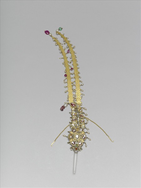 這件頭飾羽軸的根部以玉作管狀,中心部份為一圓形花卉,羽片部位兩側並排著一顆顆由大漸小的圓形寶石,末端以偏向一側垂掛而下的單顆寶石收尾,最特別的是在這片羽毛的背後,特別加上兩隻長長的金冠羽。附件木盒上寫著「金玉吉爾哈」,「吉爾哈」很可能是波斯語「jigha」的音譯,指印度和伊斯蘭王室、貴族頭巾上佩戴的羽毛狀頭飾。原本屬於貴族使用的羽狀頭飾在十八、十九世紀以後發展出更多的變化,樣式繁複或變形的設計,使頭飾純以追求華麗為目的,脫離了原來作為身份象徵的意義體系。乾隆三十五年(1770)喀什噶爾呈進。