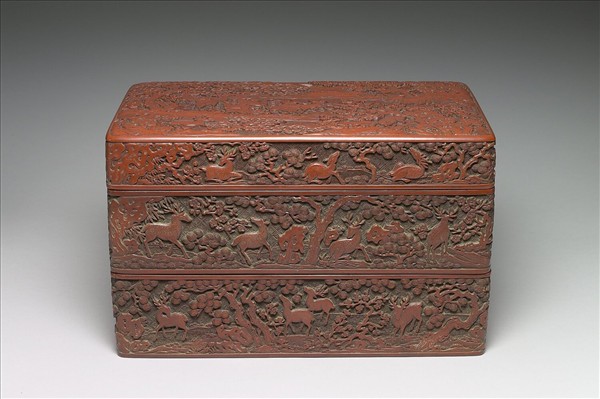 長方形兩層盒,上層另加一承盤,上層底部四角有卡榫可卡住下層,下層平底無足,承盤、盒內及盒底髹黑漆。盒側長邊與短邊圖案相連,相對應邊的圖案左右相反,連接成一連續圖畫,蓋及上下層均構圖不同。藉著松樹、梅樹與太湖石分隔一隻隻鹿,鹿的姿態變化豐富,蹲、半蹲、回首、昂首等。盒蓋為江渚群鹿,一水自左上呈之字形切割畫面,前景左右各有太湖石搭配梅、或松竹,一鹿居其中。中景偏畫面左側,茂盛的松樹下十餘鹿或眺望對岸,遠方一隻雄鹿昂首闊步的出現在群鹿面前。物象底刻錦地,漆色紅偏暗,漆質澀,刀法銳利,純熟掌握物象,姿態協調,構圖推展平順,和萬曆五彩百鹿尊有相同之處。