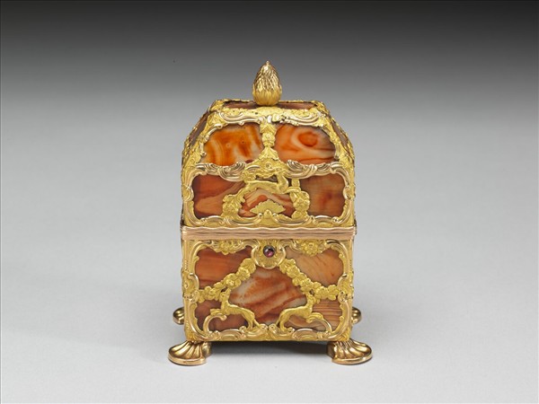 長方拱形蓋匣,鑲瑪瑙與鍍金花環奔鹿邊飾,底部四角配置獅足托座。內匣盛裝橢圓小鏡,切稜旋鈕透明玻璃方瓶,刀、剪、匙,及鉛筆、書寫用象牙片。此類袖珍組件匣盒,裝盛物件多包括修容理妝用品,流行於十八世紀歐洲上層社會。