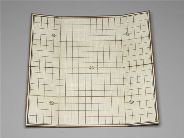 本件棋盤為薄木胎,外裱白絹,以墨筆界格,縱橫各19道。另面則繪象棋盤。展開後一面可下圍棋,一面下象棋,可摺叠收攏成對開四合的小冊頁,以便携帶出遊。棋盤收貯於〈天府球琳〉百什件(故漆374),由屜內原有清冊,可知原本搭配有玉圍棋子及玉象棋子。