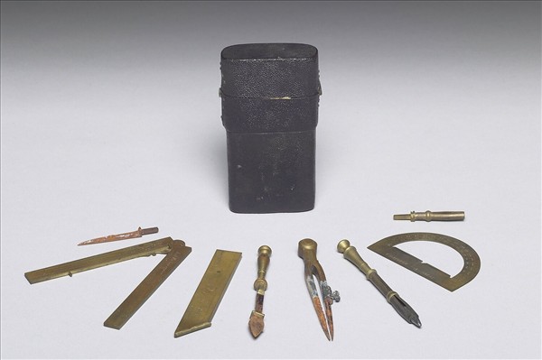 這是一組收貯於皮質外盒中的袖珍繪圖儀器,包括半圓儀、比例尺、折疊角尺、兩角規、鉛筆、鴨嘴筆、針筆共七件。外盒皮質堅實細緻,盒身分為七小格,盒蓋與盒身相連處有點狀壓花裝飾,蓋內襯有深紅色絲絨。此套攜帶式量測繪圖工具,各類尺度鐫刻精密,組裝完整,由半圓儀與比例尺上刻文可知,此組工具可能出自十七世紀後半葉至十八世紀初期 Louis Chapotot 與其子 Jean Chapotot 設於巴黎的光學與數學儀器製作工坊。