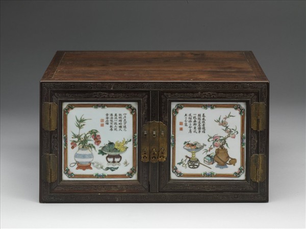 此件為縮小的頂箱櫃,分成上下櫃(故雜695、故雜853),櫃體用紫檀木製成,正面骨架皆嵌銀絲,並有嵌彩瓷博古圖作為裝飾。上下櫃打開,內有玉璧冊頁及木屜,其正面以紫檀木浮雕開窗各種吉祥紋樣為裝飾,內部則有犀角雕刻,銅器、瓷器、玉器、書畫、日本漆盒以及西洋懷錶。明屜暗屜交錯使用呈現出空間感,同時搭配各種古玩,顯現百什件豐富之樣貌。