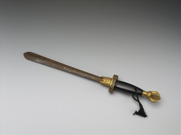木柄劍,鐵鍍金五股杵劍首,柄黑有穿,穿黑絲繩。劍格表面鏨拉長如意雲紋外廓,劍刃作柳葉式,摩羯首銜之。為降魔法器。