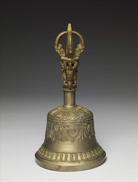 金剛鈴,鈴身頂面覆蓮瓣,蓮瓣中梵字,鈴身外壁以獸首啣纓絡為主要紋飾,緣飾金剛杵紋及蓮瓣紋與梵紋,紋飾浮雕較高出器面。又外壁獸首間纓絡彼此垂連並圍出空間,空間中飾蓮花、金剛杵等器用。鈴內中央鑄陽紋蓮花。柄首接鍍金五股杵頂及戴冠佛首,佛長面形,寬額高鼻,細部的冠戴均雕刻細緻。修法時搖動金剛鈴,使諸尊警覺、喜悅。