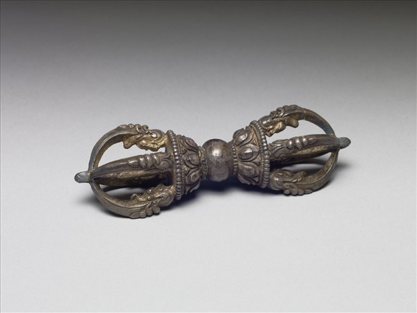 金剛杵。兩端首作五股式,摩羯首銜之,托以蓮瓣。手執處光素。附皮盒,與另件銅鈴共成一套。密宗佛教中,金剛杵為諸尊之持物或修法的道具,能破除魔障。五股杵代表五智五佛。