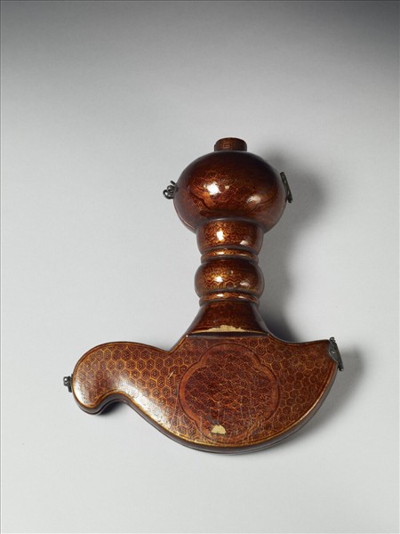 皮盒,內置金剛斧,盒隨器形。漆色亮,盒外龜甲紋錦地、花葉紋,並有海棠形開光,內繪花葉紋;杵盒之側邊裝合葉,盒側邊為插銷,可開啟使盒左右打開,內襯紅色花綾裡,並有四體字白籤,漢字部分為:「大利益金剛斧」。
