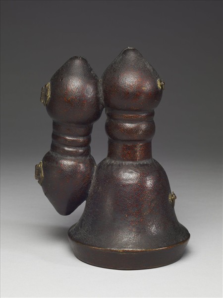 皮盒,內置鈴、杵,盒隨器形,分作鈴、杵之形而以金屬零件相接連。漆色黯褐,盒壁隱約為大朵滿鋪的蓮花,及帶狀的連枝菊花與回紋、渦捲紋、三角紋等。盒底為一長喙鵲鳥展翅立於蓮花上。盒內墨書漢、滿、蒙、藏四體字。