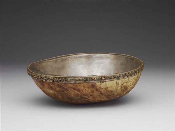 嘎布拉碗,外壁黃褐色。口緣與內壁鑲鍍金銀質裡,口緣嵌飾圓形珊瑚、松石各色石一周,上下並鏨飾金屬連珠紋。嘎布拉碗多係用生前許願者之頭骨,經大喇嘛嚴格審察、認可後,方製成器而獻與佛者。