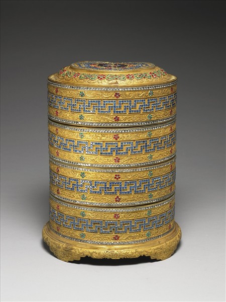 銅質鍍金,分梯形盒蓋及三層扁圓盒體,底層連接足座。以模鑄製作圖紋,並留鑲嵌各色料石的凹槽,蓋頂中央飾嵌石紫色菊花紋,外圈飾一圈紅色五瓣花紋,再接一圈藍色如意雲紋,外為一圈白色料石,以及朵花盤長紋相間圖紋;各層側邊中央為藍色卍字不斷紋,上下鑄飾卷葉紋及嵌石花朵紋花邊,上下嵌白色料石邊飾,底座為如意雲足,邊飾卷葉紋。