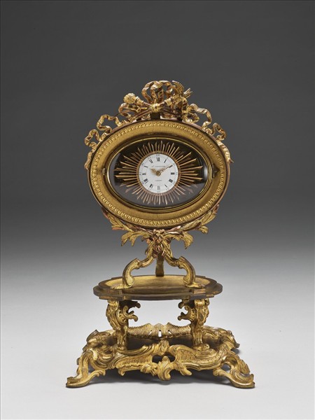 圓形錶面,以羅馬數字標示時,阿拉伯數字標示分、秒,錶面周圍裝飾太陽形光芒,上有橢圓形玻璃罩,橢圓形錶體,周圍裝飾一圈花瓣紋,上方裝飾劍筒、火炬及彩帶,下方以莨苕葉紋為托,下接獸足,後方有一發條旋鈕,置於二層臺座上,上層為雙層座面,下接四鷹鳥座足,下層為花葉紋裝飾。背有文字「Willm Carpenter London」及速度調整刻度:「FASTER」、「1~9」、「SLOWER」,附鑰匙二把。