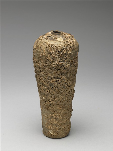 直口,豐肩,斂腹。口沿周圍上褐色釉,瓶身上白釉,器表為許多捲曲管狀的海洋生物遺骸所附著,也有些許貝殼的殘跡,可能是由海底挖掘出的考古文物。附錦袱一。