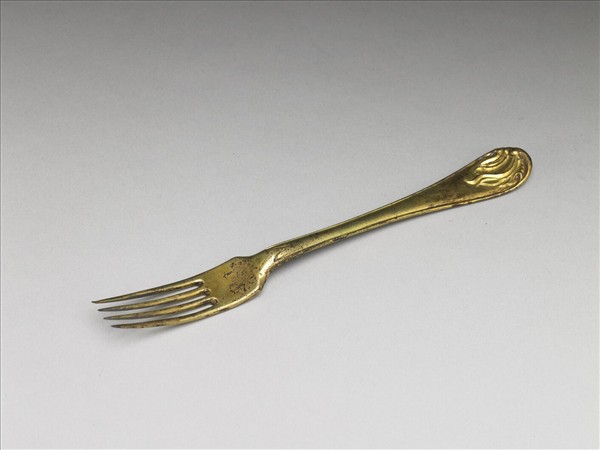 土爾扈特部是漠西蒙古的一支,十八世紀中葉自伏爾加河下游長途跋涉東返伊犂舊地。乾隆三十六年(1771)九月乾隆皇帝在熱河接見其首領渥巴錫(1742-1775),渥巴錫先後呈進七寶刀和金錯刀。乾隆三十九年(1774)渥巴錫呈進〈銅鎏金叉刀匙一組〉,清高宗《御製詩集》中提到,這組禮物盛裝在皮盒中,由三等侍衛阿思哈轉呈皇帝。夾註中還特別解釋「叉」是餐具,而不是魚叉或髮釵,可見餐叉的使用在當時並不常見。刀叉的組合主要和食肉的飲食習慣有關,明清時期以箸、匙為主要餐具,這組餐具的裝飾紋樣以及器形都和俄羅斯十八世紀洛可可的風格有關,應為土爾扈特部在俄羅斯境內時的用品。