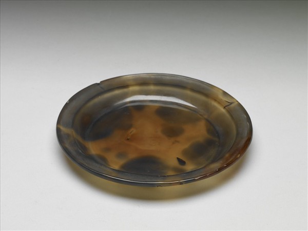 褐色瑪瑙,有深褐色斑塊,敞口,折沿,淺壁,圈足。全器光素無紋,底部陰刻乾卦和「正德」二字。