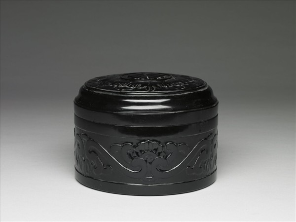 玻璃製圓盒,子母口,直腹,凹底,附階形子母口蓋。蓋面中央為一圓圈中有八瓣花紋,外層圍有一圈六角形花瓣紋;器壁外為轉枝花葉紋。