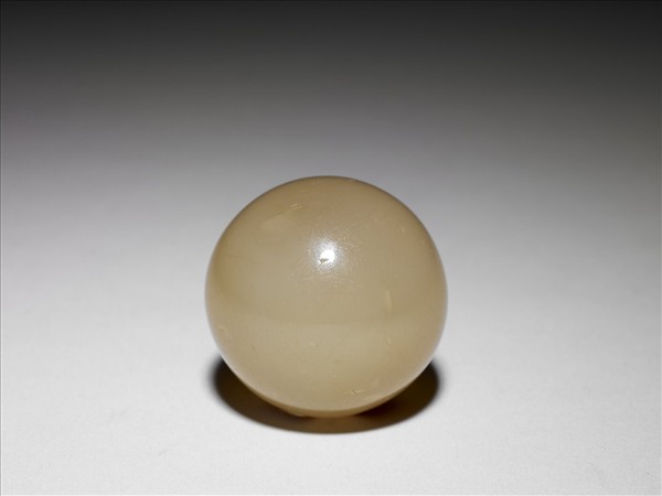 灰白色瑪瑙,局部微泛黃。全器琢成一外表光滑圓潤之球,器表光素無紋。