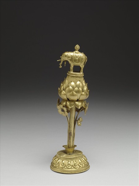 清宮作品,十八世紀。佛經《俱舍論》言,轉輪王出現於世,便有七寶出現世間;此七寶為輪寶、象寶、馬寶、珠寶、女寶、主藏臣寶、主兵臣寶。象寶象徵力大無窮,托在盛開的蓮花上,蓮花梗與數朵小花葉成束的立在蓮座上;鍍金銅片點焊相接,並略嵌松石、珊瑚,甚輕巧。