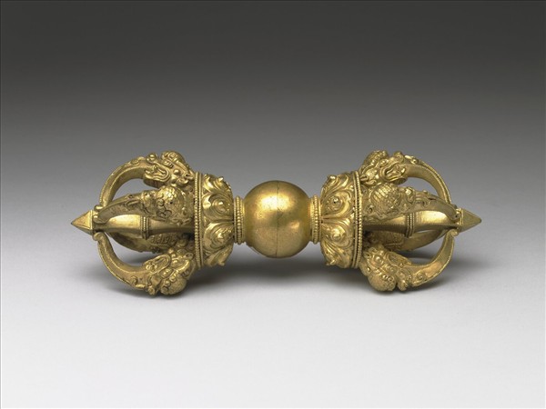鍍金五股金剛杵,兩端首尖銳,底端為張口魔羯首,托以蓮瓣。蓮瓣上下各飾數圈連珠紋。手執處為一光素無紋之圓球。密宗佛教中,金剛杵象徵摧滅煩惱的菩提心,為諸尊之持物或修法的道具,能破除魔障。五股杵代表五智五佛。