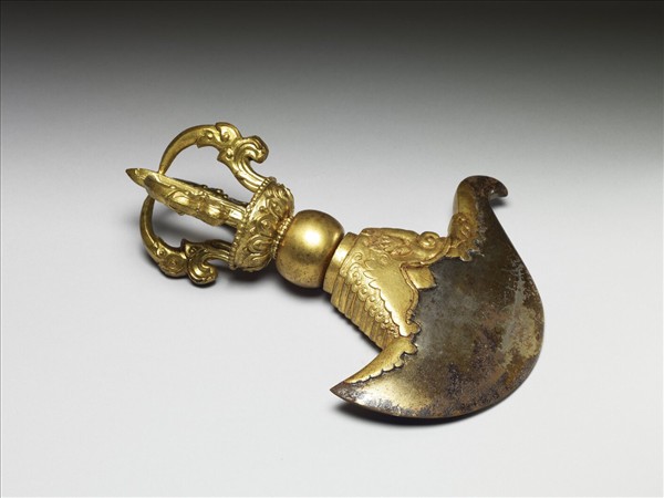 鍍金法器,柄端作五股杵狀,下端為彎月形寬刃鉞,以摩羯首銜之;銀色鐵刃的一側為彎鉤狀。柄與刃以螺絲轉旋固定成器。金剛杵身下方帶一圈蓮辦紋。五股杵代表五智五佛。