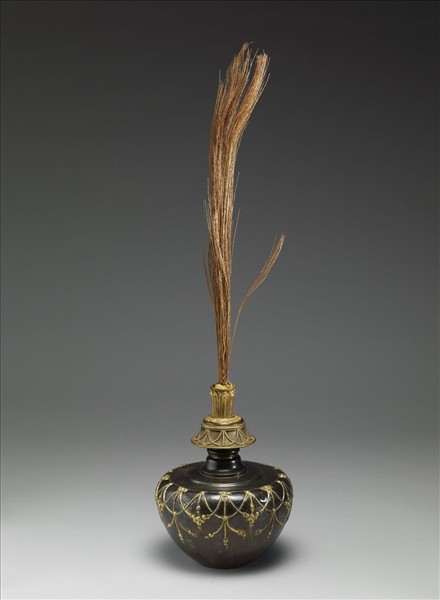 似西藏作品,十八世紀。銀壺,小口,翻領向下敞披,寬肩,斂腹,底向內圓凹。通體色呈黝黑而亮,浮雕部分如口緣的如意雲紋、領部及肩腹處的瓔珞紋,則鍍金明亮。口部另插入同質地之長管,管口浮雕蓮瓣紋;管內插乾燥的藏草一束。此為盛甘露水、灑佈甘露的容器。