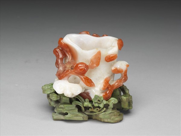 瑪瑙福壽桃幹形水洗,以紅白雙映的瑪瑙搭配茜綠染牙座,以色彩取勝,引人注意。
